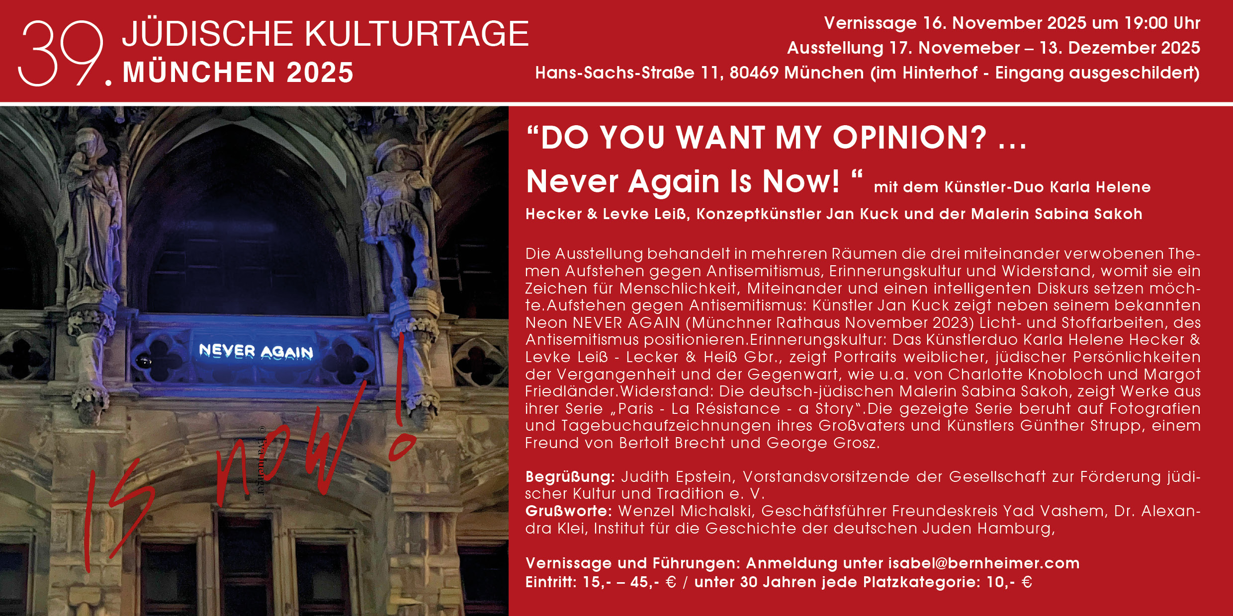 Die Ausstellung behandelt in mehreren Räumen die drei miteinander verwobenen Themen Aufstehen gegen Antisemitismus, Erinnerungskultur und Widerstand, womit sie ein Zeichen für Menschlichkeit, Miteinander und einen intelligenten Diskurs setzen möchte. Aufstehen gegen Antisemitismus: Konzeptkünstler Jan Kuck zeigt neben seinem bekannten Neon NEVER AGAIN (Münchner Rathaus November 2023) Licht- und Stoffarbeiten, des Antisemitismus positionieren. Erinnerungskultur: Das Künstlerduo Karla Helene Hecker & Levke Leiß – Lecker & Heiß Gbr., zeigt Portraits weiblicher, jüdischer Persönlichkeiten der Vergangenheit und der Gegenwart, wie u.a. von Charlotte Knobloch und Margot Friedländer. Widerstand: Die deutsch-jüdischen Malerin Sabina Sakoh, zeigt Werke aus ihrer Serie „Paris – La Résistance“. Die gezeigte Serie beruht auf Fotografien und Tagebuchaufzeichnungen ihres Großvaters und Künstlers Günther Strupp, einem Freund von Bertolt Brecht und George Grosz.