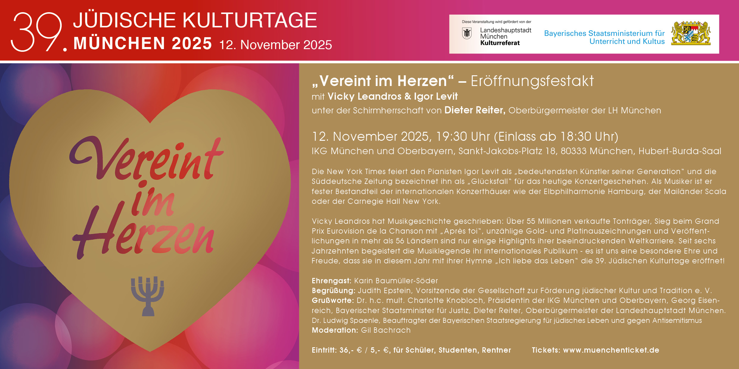 Vicky Leandros hat Musikgeschichte geschrieben: Über 55 Millionen verkaufte Tonträger, Sieg beim Grand Prix Eurovision de la Chanson mit „Après toi“, unzählige Gold- und Platinauszeichnungen und Veröffentlichungen in mehr als 56 Ländern sind nur einige Highlights ihrer beeindruckenden Weltkarriere. Seit sechs Jahrzehnten begeistert die Musiklegende ihr internationales Publikum – es ist uns eine besondere Ehre und Freude, dass sie in diesem Jahr mit ihrer Hymne „Ich liebe das Leben“ die 39. Jüdischen Kulturtage eröffnet!