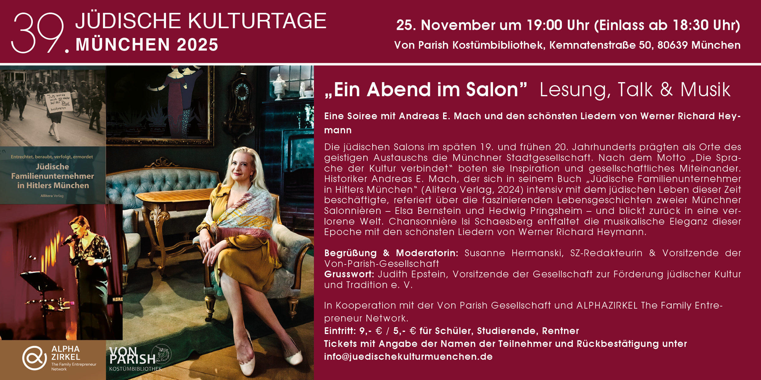 Die jüdischen Salons im späten 19. und frühen 20. Jahrhunderts prägten als Orte des geistigen Austauschs die Münchner Stadtgesellschaft. Nach dem Motto „Die Sprache der Kultur verbindet“ boten sie Inspiration und gesellschaftliches Miteinander. Historiker Andreas E. Mach, der sich in seinem Buch „Jüdische Familienunternehmer in Hitlers München“ (Allitera Verlag, 2024) intensiv mit dem jüdischen Leben dieser Zeit beschäftigte, referiert über die faszinierenden Lebensgeschichten zweier Münchner Salonnieren – Elsa Bernstein und Hedwig Pringsheim – und blickt zurück in eine verlorene Welt. Chansonnière Isi Schaessborg entfaltet die musikalische Eleganz dieser Epoche mit den schönsten Liedern von Werner Richard Heymann.