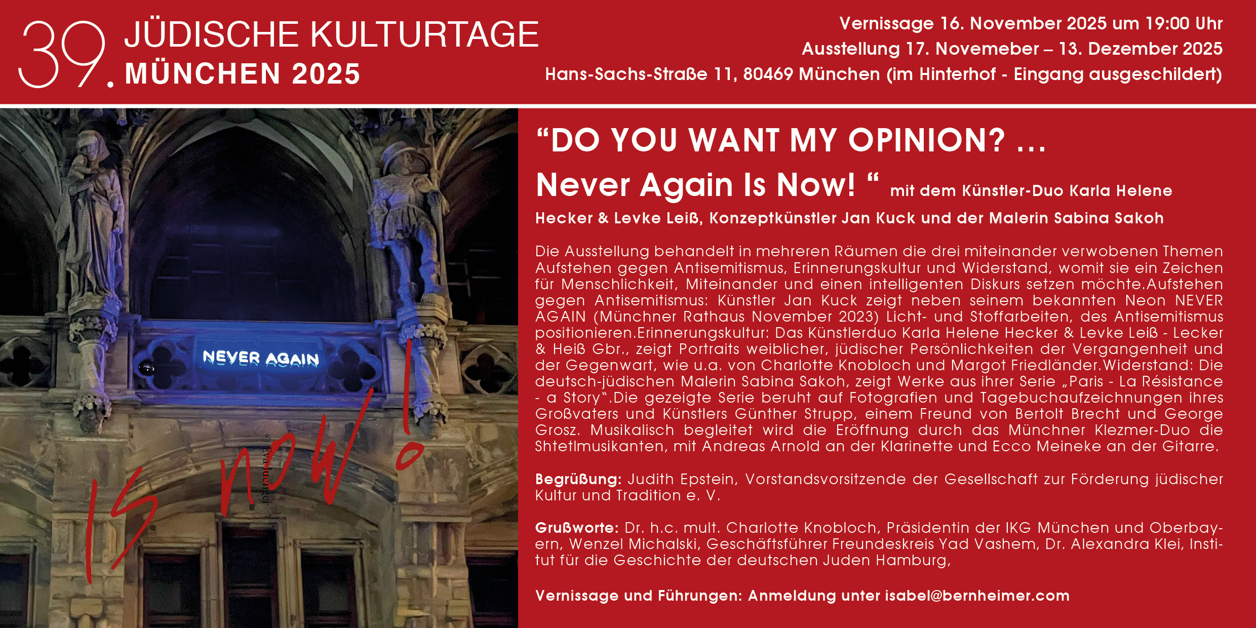 Die Ausstellung behandelt in mehreren Räumen die drei miteinander verwobenen Themen Aufstehen gegen Antisemitismus, Erinnerungskultur und Widerstand, womit sie ein Zeichen für Menschlichkeit, Miteinander und einen intelligenten Diskurs setzen möchte. Aufstehen gegen Antisemitismus: Künstler Jan Kuck zeigt neben seinem bekannten Neon NEVER AGAIN (Münchner Rathaus November 2023) Licht- und Stoffarbeiten, des Antisemitismus positionieren. Erinnerungskultur: Das Künstlerduo Karla Helene Hecker & Levke Leiß – Lecker & Heiß Gbr., zeigt Portraits weiblicher, jüdischer Persönlichkeiten der Vergangenheit und der Gegenwart, wie u. a. von Charlotte Knobloch und Margot Friedländer. Widerstand: Die deutsch-jüdischen Malerin Sabina Sakoh, zeigt Werke aus ihrer Serie „Paris – La Résistance – a Story“. Die gezeigte Serie beruht auf Fotografien und Tagebuchaufzeichnungen ihres Großvaters und Künstlers Günther Strupp, einem Freund von Bertolt Brecht und George Grosz. Musikalisch begleitet wird die Eröffnung durch das Münchner Klezmer-Duo die Shtetlmusikanten, mit Andreas Arnold an der Klarinette und Ecco Meineke an der Gitarre.