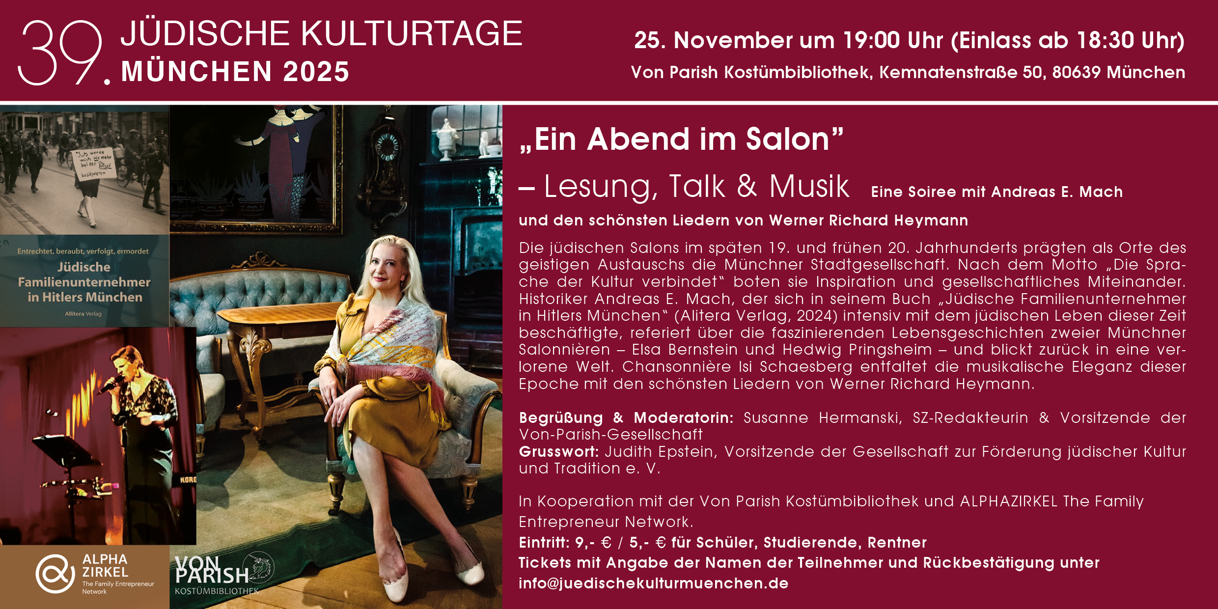 Die jüdischen Salons im späten 19. und frühen 20. Jahrhunderts prägten als Orte des geistigen Austauschs die Münchner Stadtgesellschaft. Nach dem Motto „Die Sprache der Kultur verbindet“ boten sie Inspiration und gesellschaftliches Miteinander. Historiker Andreas E. Mach, der sich in seinem Buch „Jüdische Familienunternehmer in Hitlers München“ (Allitera Verlag, 2024) intensiv mit dem jüdischen Leben dieser Zeit beschäftigte, referiert über die faszinierenden Lebensgeschichten zweier Münchner Salonnieren – Elsa Bernstein und Hedwig Pringsheim – und blickt zurück in eine verlorene Welt. Chansonnière Isi Schaesberg entfaltet die musikalische Eleganz dieser Epoche mit den schönsten Liedern von Werner Richard Heymann.